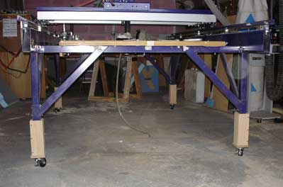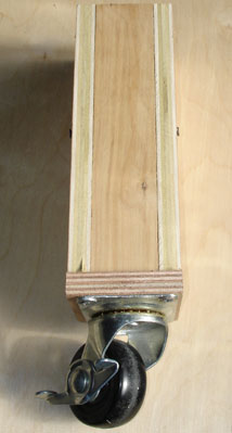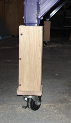 After a number of scenarios involving ramps, dollies, and lot's of large friends I came up with the following. Sort of like wheeled booties for a 'Bot. Just took 3"wheels (4-5"would be better)built the bootie boxes, and levered the machine into the air with a 2'by 4'so I could install them. Three sides were glued,nailed, with one side only being fastened by screws so it can be removed without having to jack the table up an extra foot to clear the bottom of the leg.