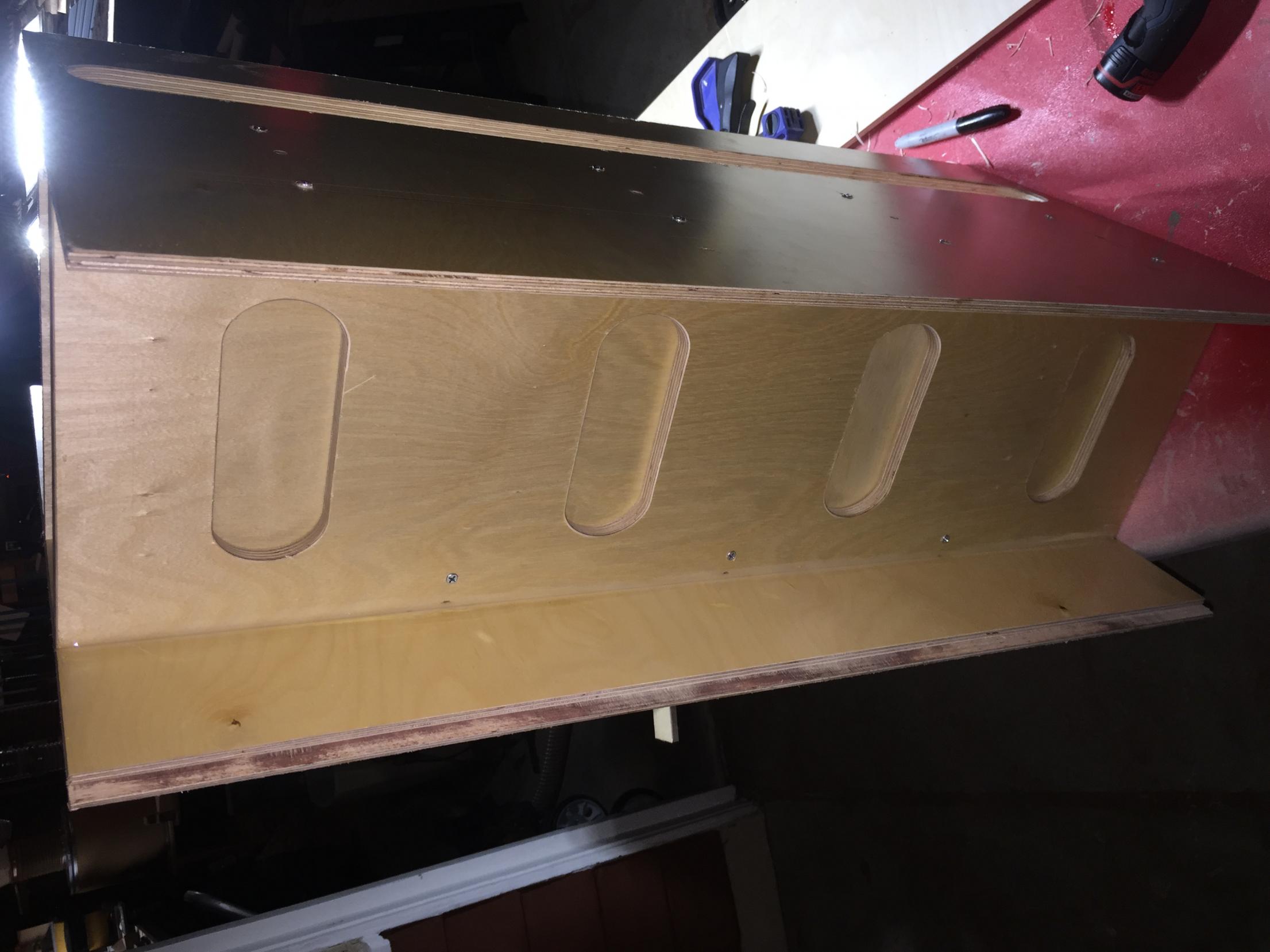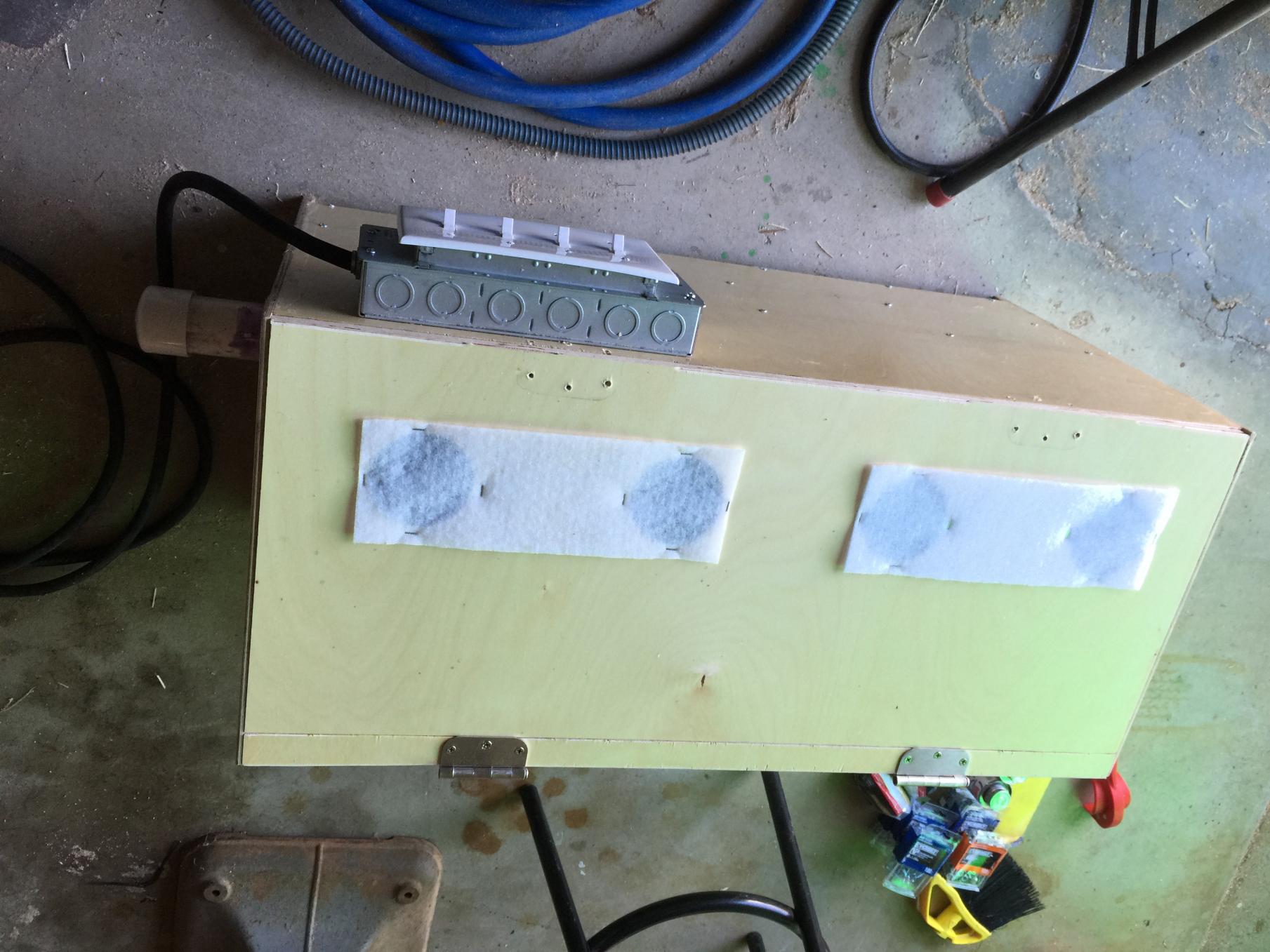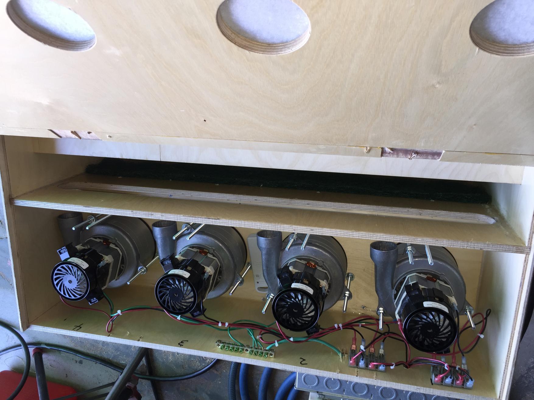 General concept is 4 of the lighthouse motors, independently controlled with 4 DPDT switches and home made check valves for each. Motors pull from a "group" vacuum area into individual chambers. Cut from one sheet of 1/2" PRE FINISHED BB, sealed with silicone on every joint. top lid opens for easy access to motors for inspection/ maintenance and blowing out filters. Check valves are gravity operated with a built in stop limiting their opening range to 80 degrees. gravity holds the check valves down, and when a motor is running, it seals the valves down hard of the other motors. when any motor is turned on, it pulls the check valves open for each of the motors individual chambers. So any combination of motors, or only using one, works great.