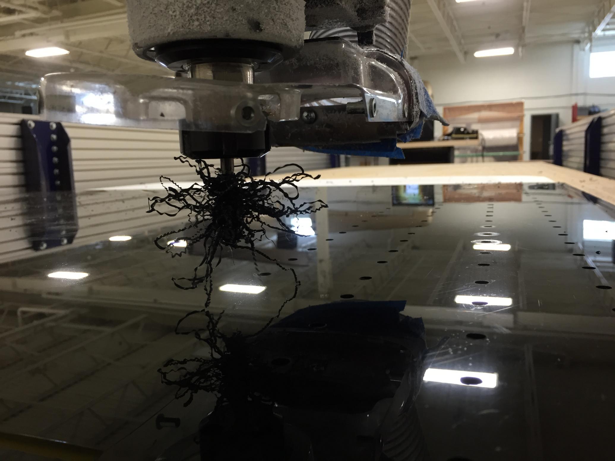 I'm sure i got a few things wrong here, For the job i'm using two bits an 1/8 inch ball nose bit (i think it came with the shopbot starter bits) and a 1/4 inch bit for drilling some of the holes. when i ran both of these bits i had the hdpe chips tangle up in the router bit, causing me to stop every so often to clean it off.
