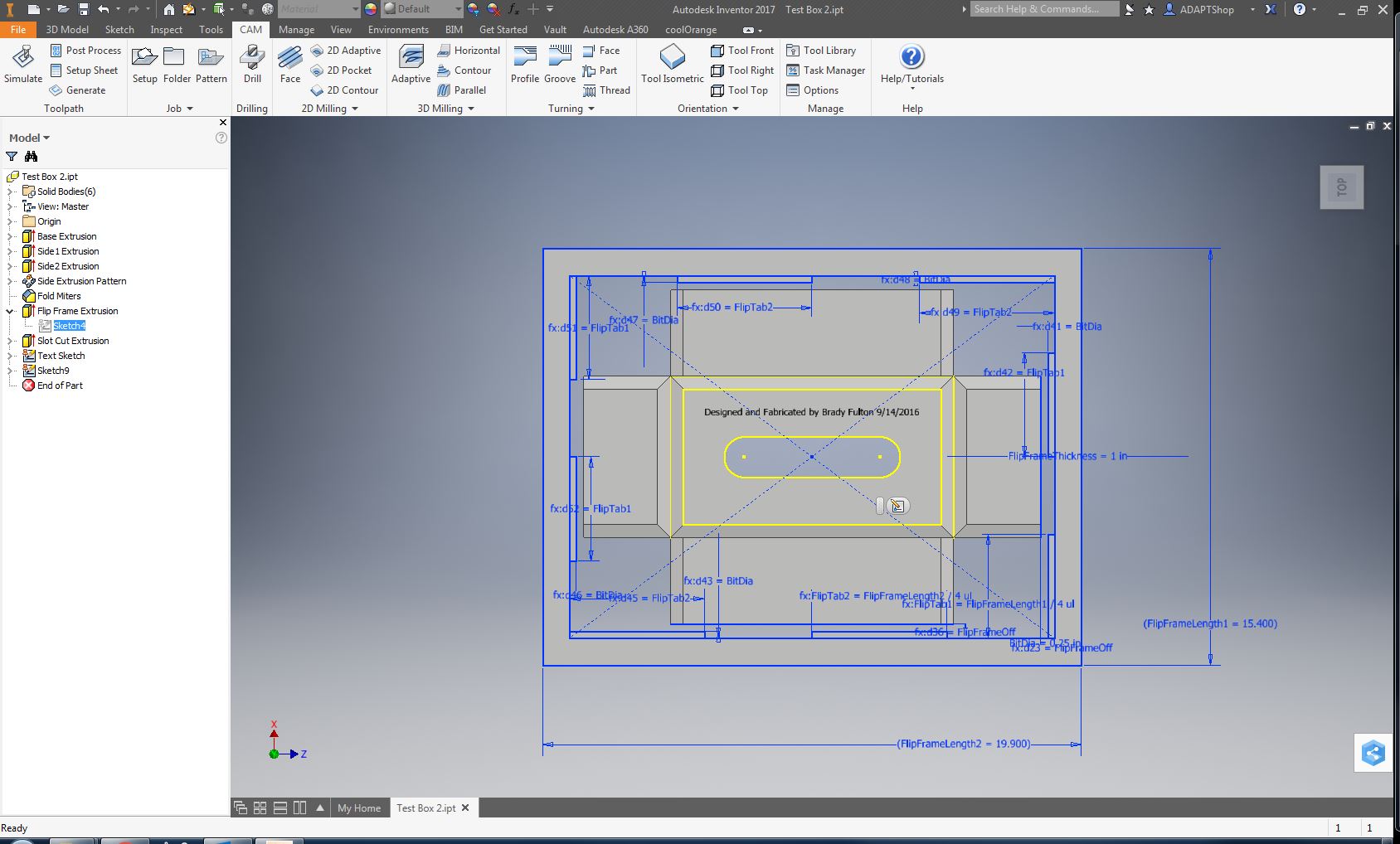 Designed in Autodesk Inventor HSM - Critical dimensions are the tabs on the inside of the flipping frame, their height needs to be your bit diameter and their length/location need to coincide with the part tabs when the part is flipped.