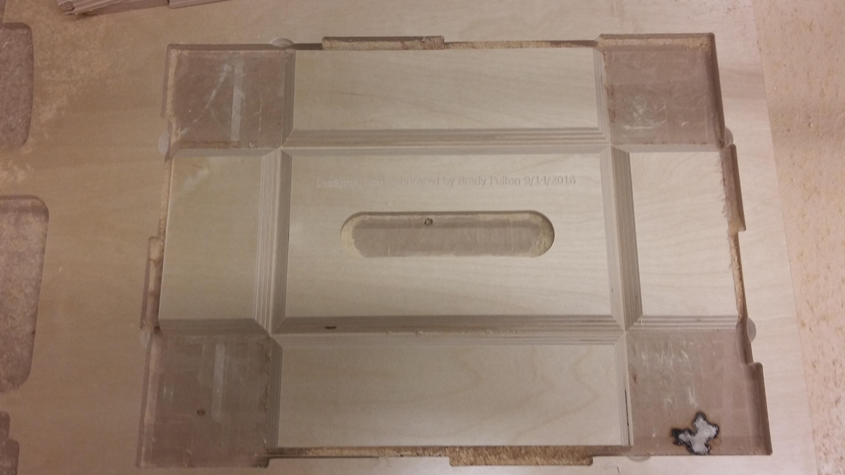 I am working on a project that would benefit from a quick method to flip the part for 2-sided cutting. I've seen guys use dowel/locator pins but had remembered seeing a video on another method that uses the edge waste to secure the part when flipping it over. Here is the original video I saw as well as some photos of my test part (tissue box cover).