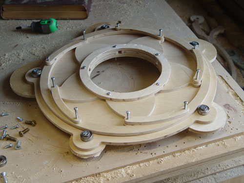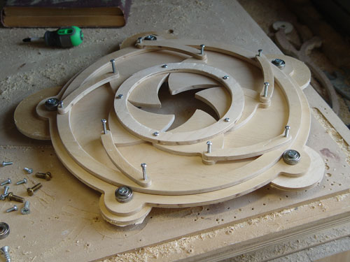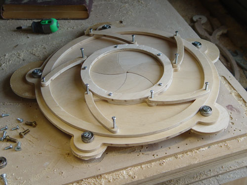 Just a prototype of a iris mechanism cut out of 1/4" birch on the bot.