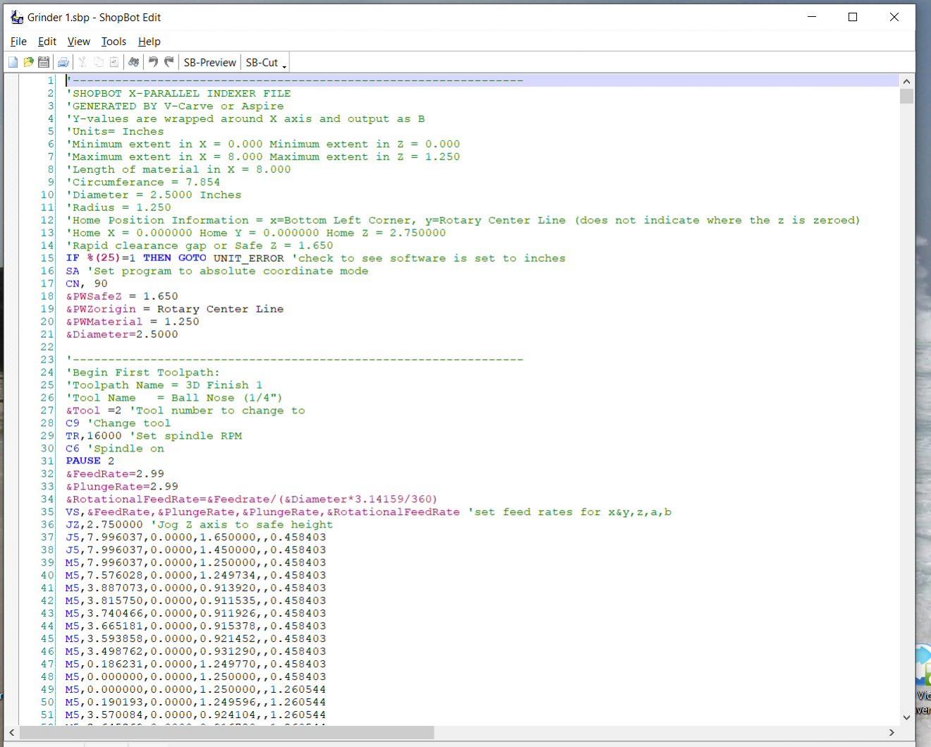 You can change it to .txt and then we can change it back to .crv3d or add it to the extension already there. The sbp file is just a screen grab, so try generating just a one tool file and then open it in the editor like you have there and put an apostrophe (') in front of the C9 and save. Do a find/replace to see if there are any other C9's.